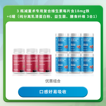 3 个月用量的 CelebrateONE 18 每天一片减重术专用复合维生素咀嚼片 + Celebrate ReBuild Protein + Probiotics 纯分离乳清蛋白+益生菌+膳食纤维粉 - ¥3647 (8.5折)