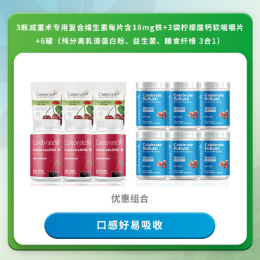 3 个月用量的 CelebrateONE 18 每天一片减重术专用复合维生素咀嚼片 + Celebrate Calcium Citrate Soft Chews 柠檬酸钙软咀嚼片 + Celebrate ReBuild Protein + Probiotics 纯分离乳清蛋白+益生菌+膳食纤维粉 - ¥4945 (8.5折)