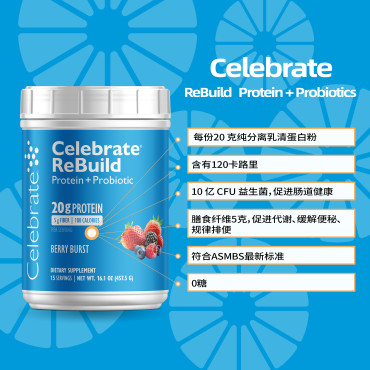 Celebrate ReBuild Protein + Probiotics 纯分离乳清蛋白+益生菌+膳食纤维粉,促进肠道微生物平衡和蛋白质强健肌肉维持肌肉量。每杯奶昔(饮料)提供 20 克纯分离乳清蛋白粉、10 亿 CFU 益生菌、益生元和 4-5克纤维。