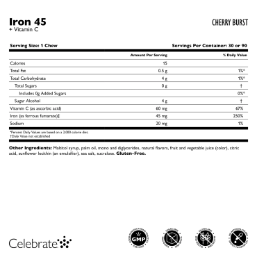 Celebrate Iron 45 + Vitamin C 铁45毫克和维生素C软咀嚼片有美味的樱桃味可供选择,不含麸质,不含糖,不含人工色素。我们使用天然成分(如姜黄)来增加颜色,以避免我们的咀嚼片使用刺激性染料。