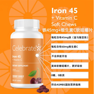 Celebrate Iron 45 + Vitamin C 铁45毫克和维生素C软咀嚼片,专用铁维生素咀嚼片含有铁,因此补充含有铁的铁维生素和钙应该间隔开2个小时后,不要与钙同时服用,以避免影响铁的吸收。