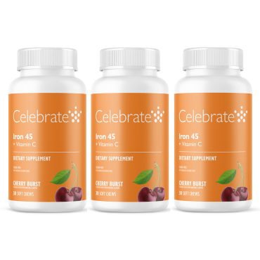 Celebrate Iron 45 + Vitamin C 铁45毫克和维生素C软咀嚼片提供 45 毫克铁,不会染色或粘在牙齿上,有助于防止缺铁。